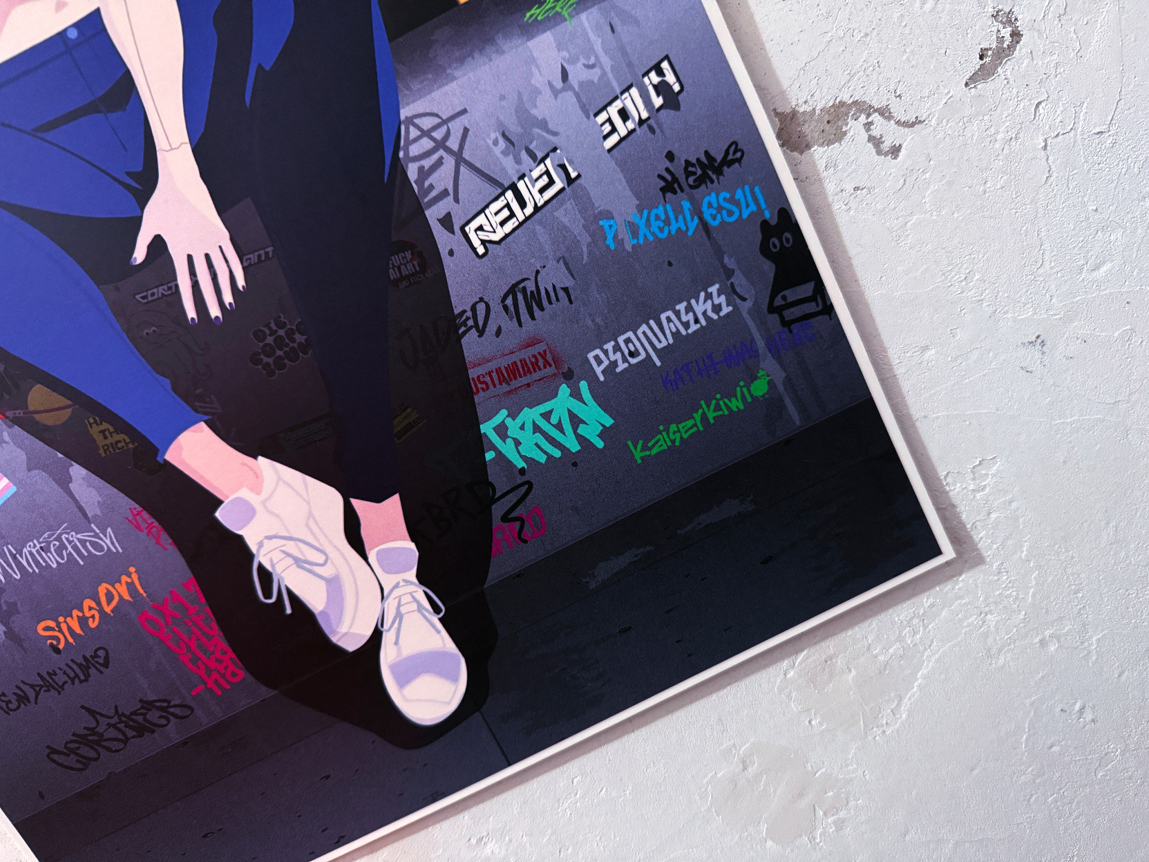 The image shows a section of an animated figure, focusing on the lower legs and feet of a character wearing white sneakers and blue clothing. The character is against a wall covered with colorful graffiti text and symbols.