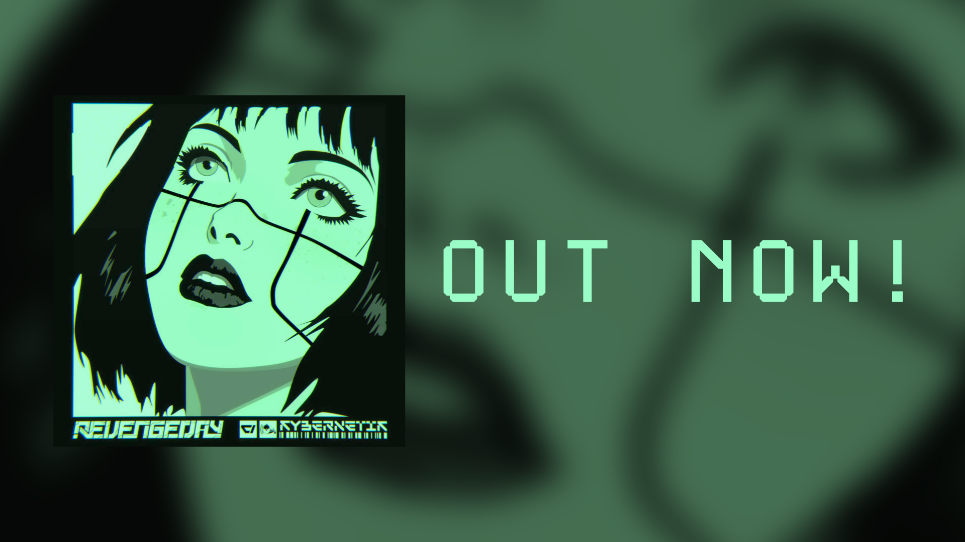 A stylized digital artwork of a female looking face with lines crossing her face (representing Cyberware), giving it a futuristic look. They has short dark hair, full lips, and eyelashes, looking upwards. On the artwork is the following text: Revengeday - Kybernetik. Next to the artwork, text reads "Out now" in a pixelated font.
