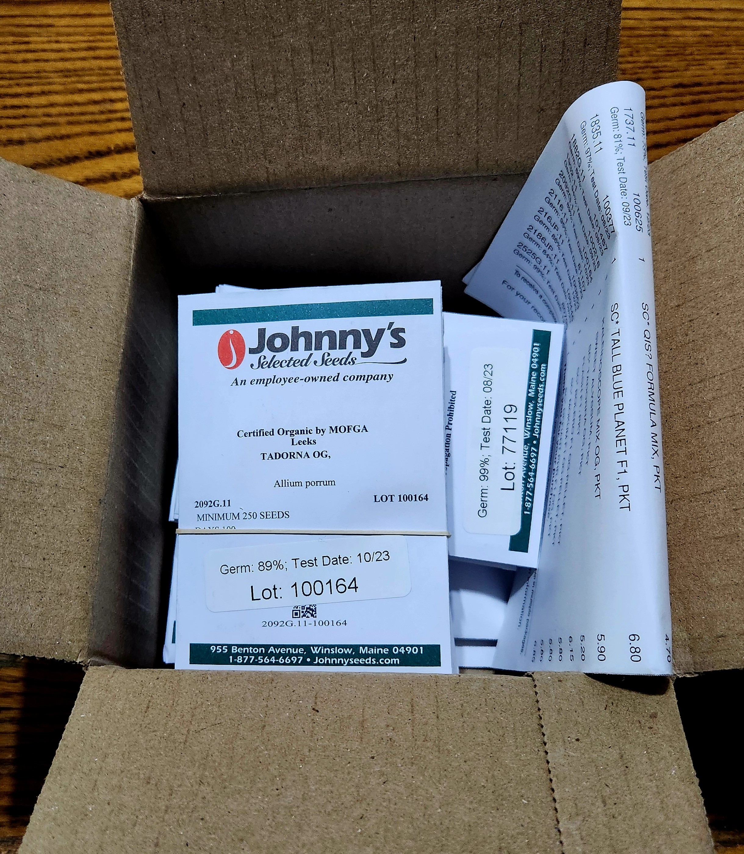 A cardboard box full of new seed packets from Johnny's sits on an old oak table.