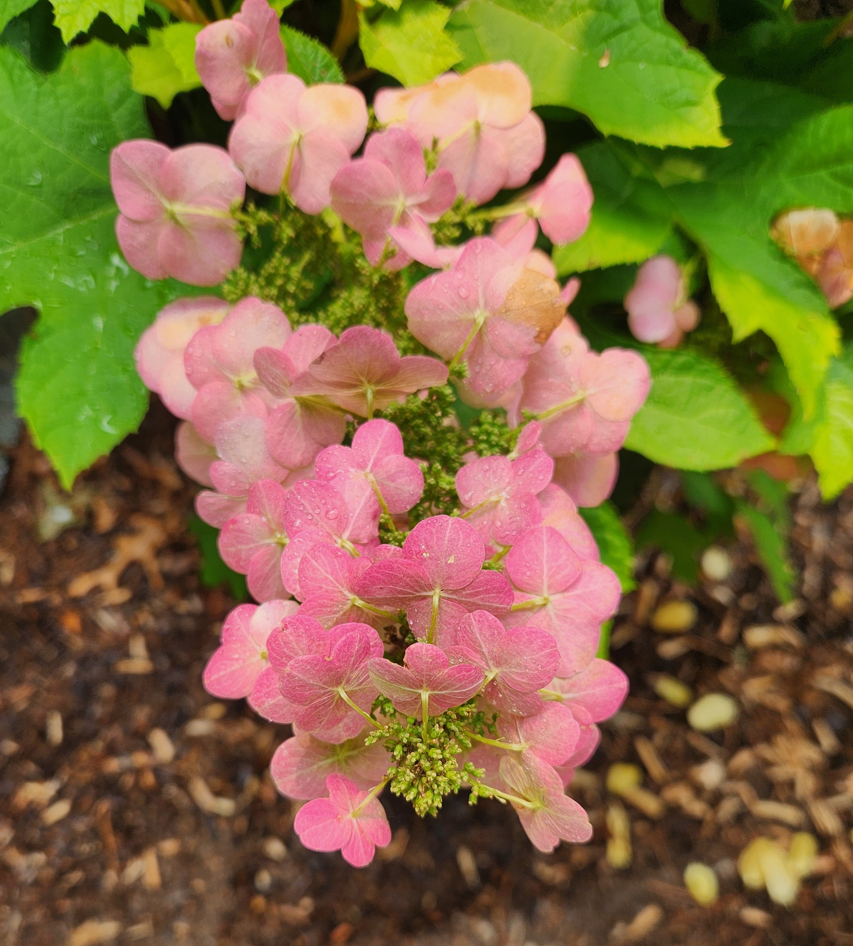 Pointing down and towards us is a pink cluster of oakleaf hydrangea flowers. Darker pink flowers closer to us, lighter pink down the stem and further back.