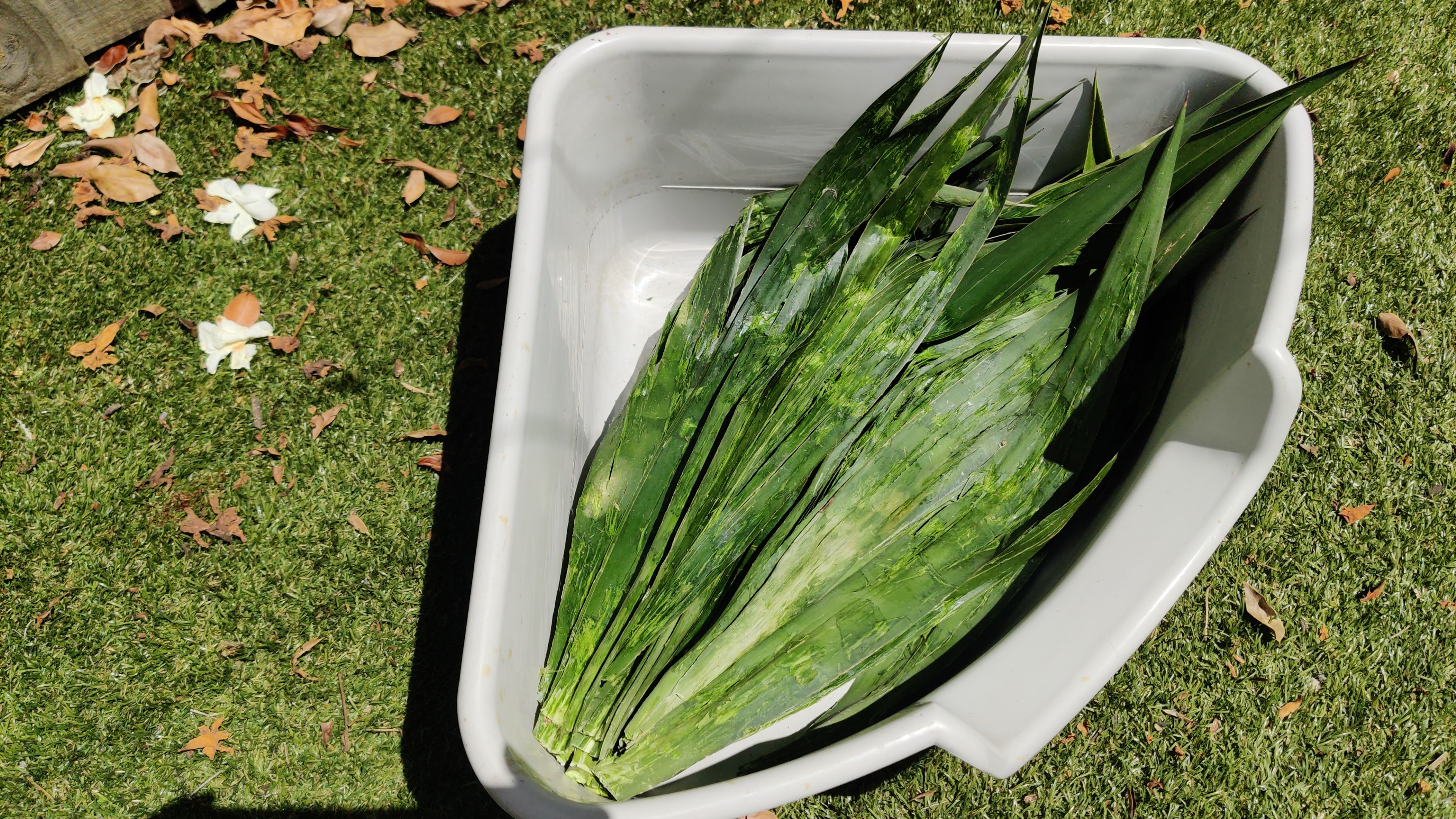 The yucca leaves, now visibly bruised, in a plastic tub.