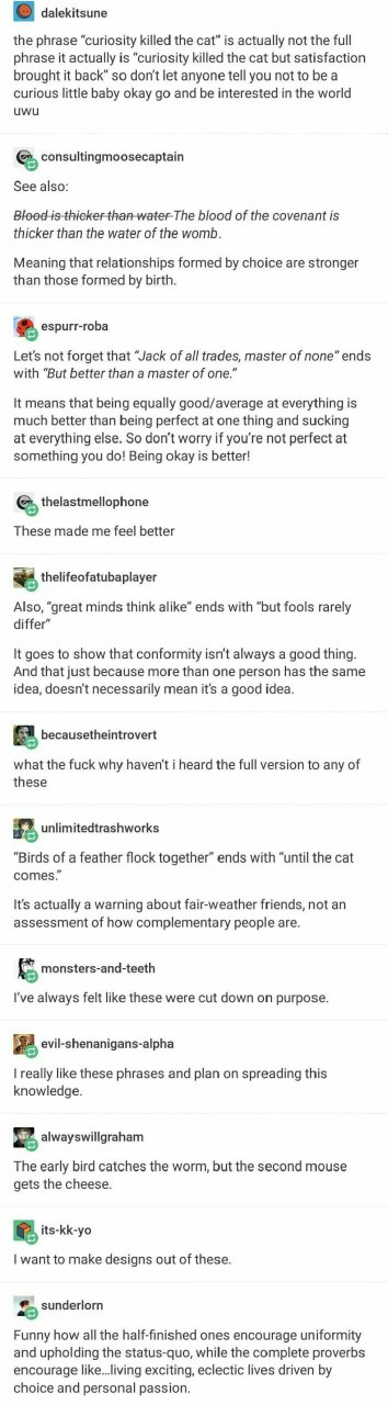 A tumblr screenshot with a bunch of sayings. no space to show all text but: the phrase “curiosity killed the cat” is actually not the full phrase t actually s ‘curiosity killed the cat but satisfaction brought it back” so don't let anyone tell you not to be-a curious little baby okay go and be interested in the world uwu See also Blood is thicker than water- The blood of the covenant is thicker than the water of the womb. Meaning that relationships formed by choice are stronger than those formed by birth Lets not forget that “Jack of all trades, master of none" ends with ‘But better than a master of one.” It means that being equally good/average at everything is much better than being perfect at one thing and sucking at everything else. So don't worry if you're not perfect at something you do! Being okay is better! Also, great minds think like’ ends with “but fools rarely differ” It goes to show that conformity isnt always a good thing And that just because more than one person has the same idea, doesnt necessarily mean it's a good idea “Birds of a feather flock together” ends with ‘until the cat comes:” its actually a warning about fair-weather frends,not an assessment of how complementary people are The early bird catches the worm, but the second mouse gets the cheese. Funny how all the halffinished ones encourage uniformity and upholding the status-quo, while the complete proverbs encourage living exciting, eclectic lives driven by choice and personal passion