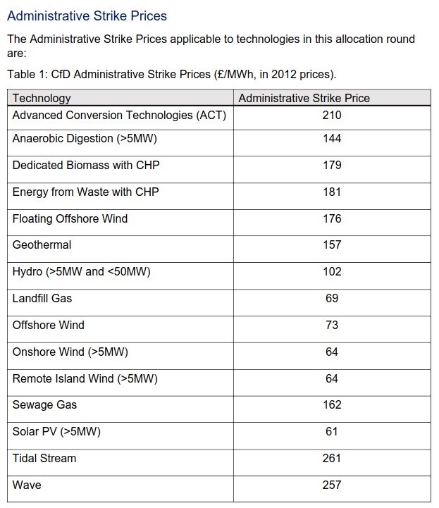 Strike prices for several wind turbine parks varying from £61 to £261 per MWh. Pounds are indexed at 2012 levels.