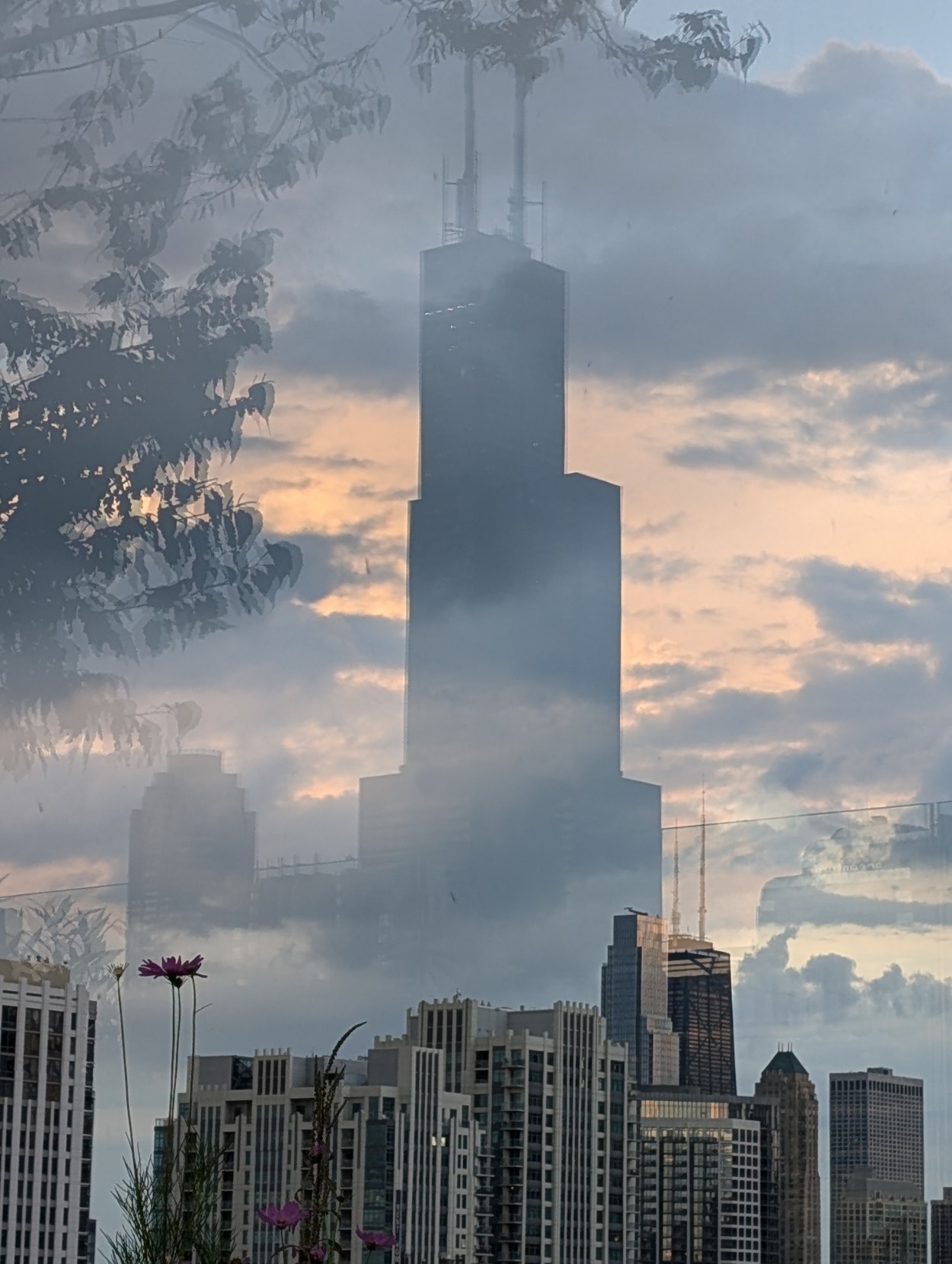 A reflection of the Willis Tower with the Hancock in the distance