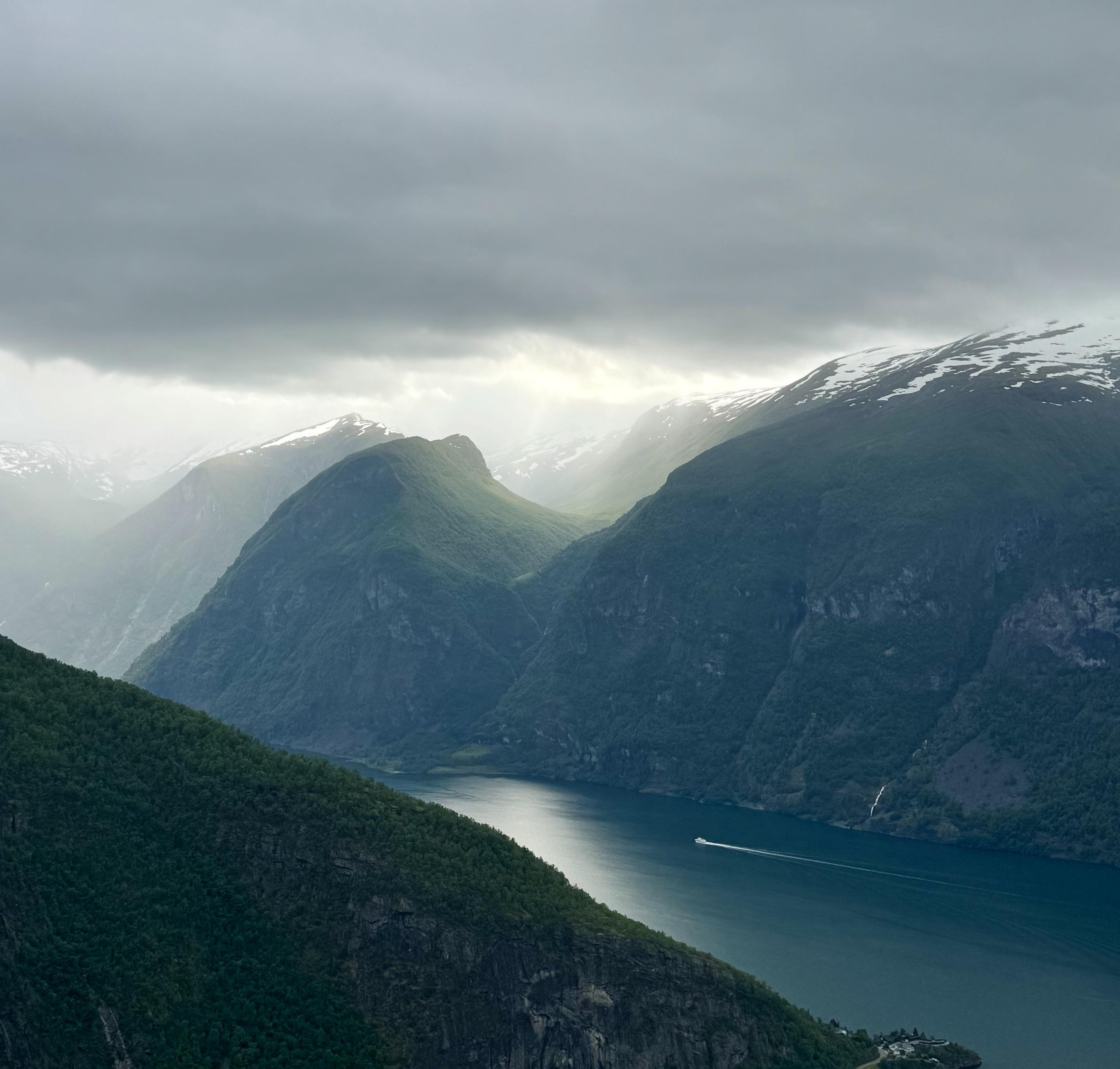 Looking out over a fjord from high up the mountainside a boat carves a white line through the teal-blue water. Itβs cloudy but the sun has found an opening to shine brightly down onto the mountain in the distance, right into a small valley between 2 peaks. The light is also reflected below on the surface of the water where it meets the mountain. Thereβs rain falling in the far distance on the left side of the picture, obscuring more peaks in a grey mist. No alt text will do Norway justice, but Iβm trying.