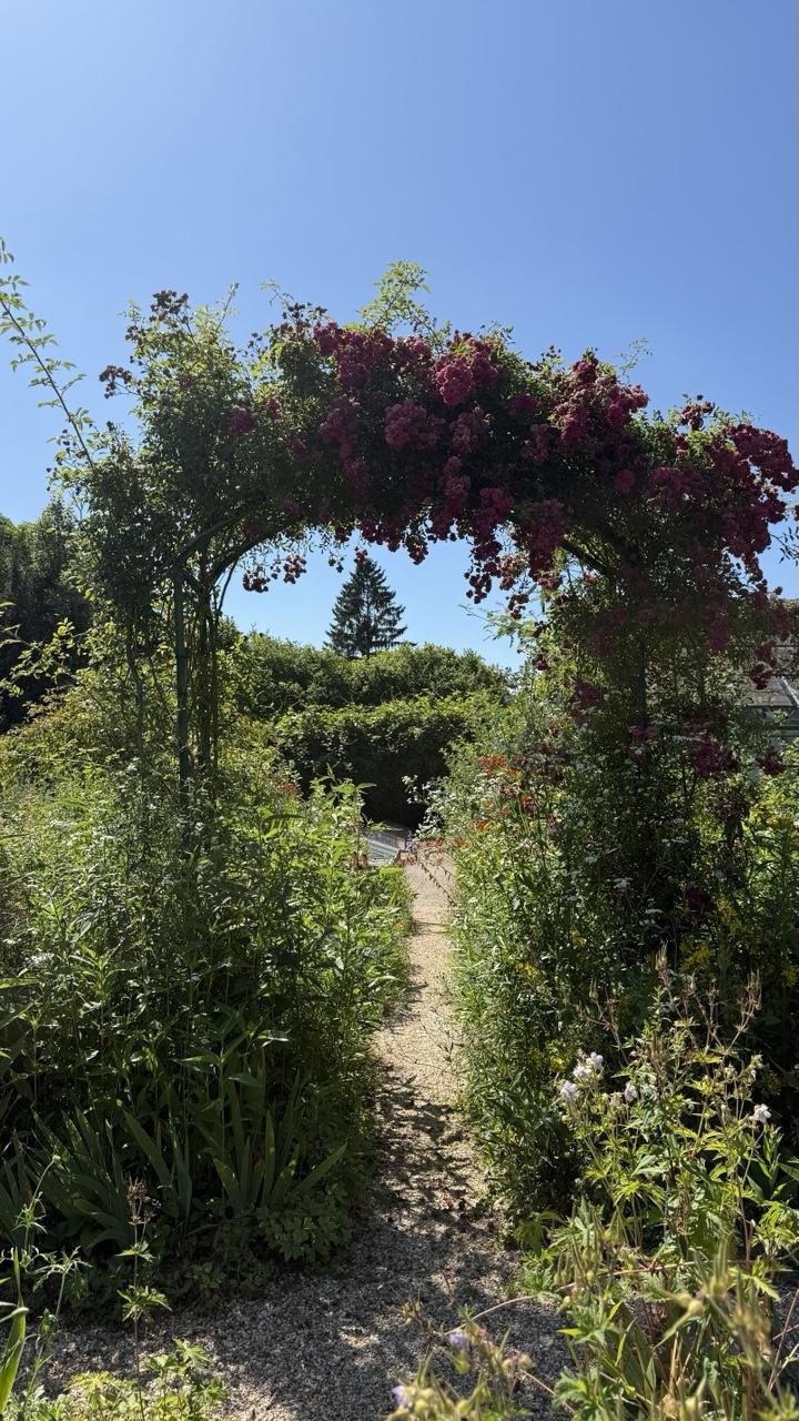 An arch of leaves and flowers in an overgrown garden. In the distance, the sky is a bright blue