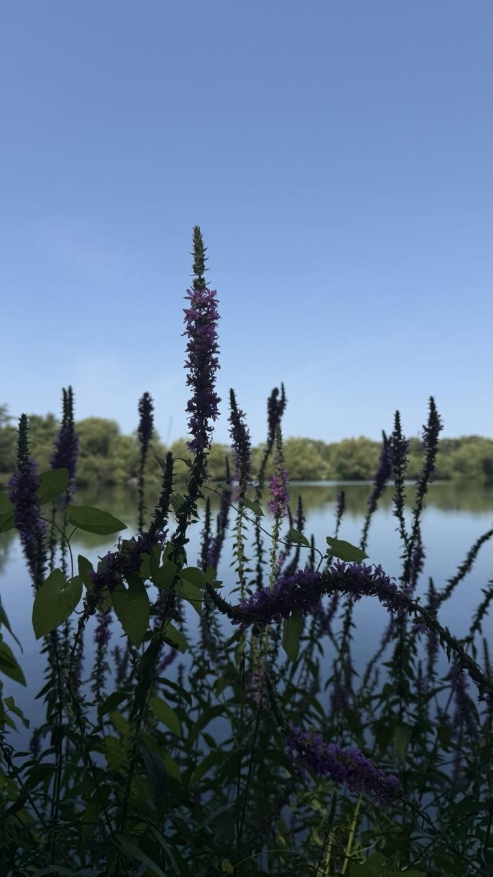 Purple loosestrife appear in profile with a blue sky and the still surface of the lake in the background. The plant looks like purple bottle brushes
