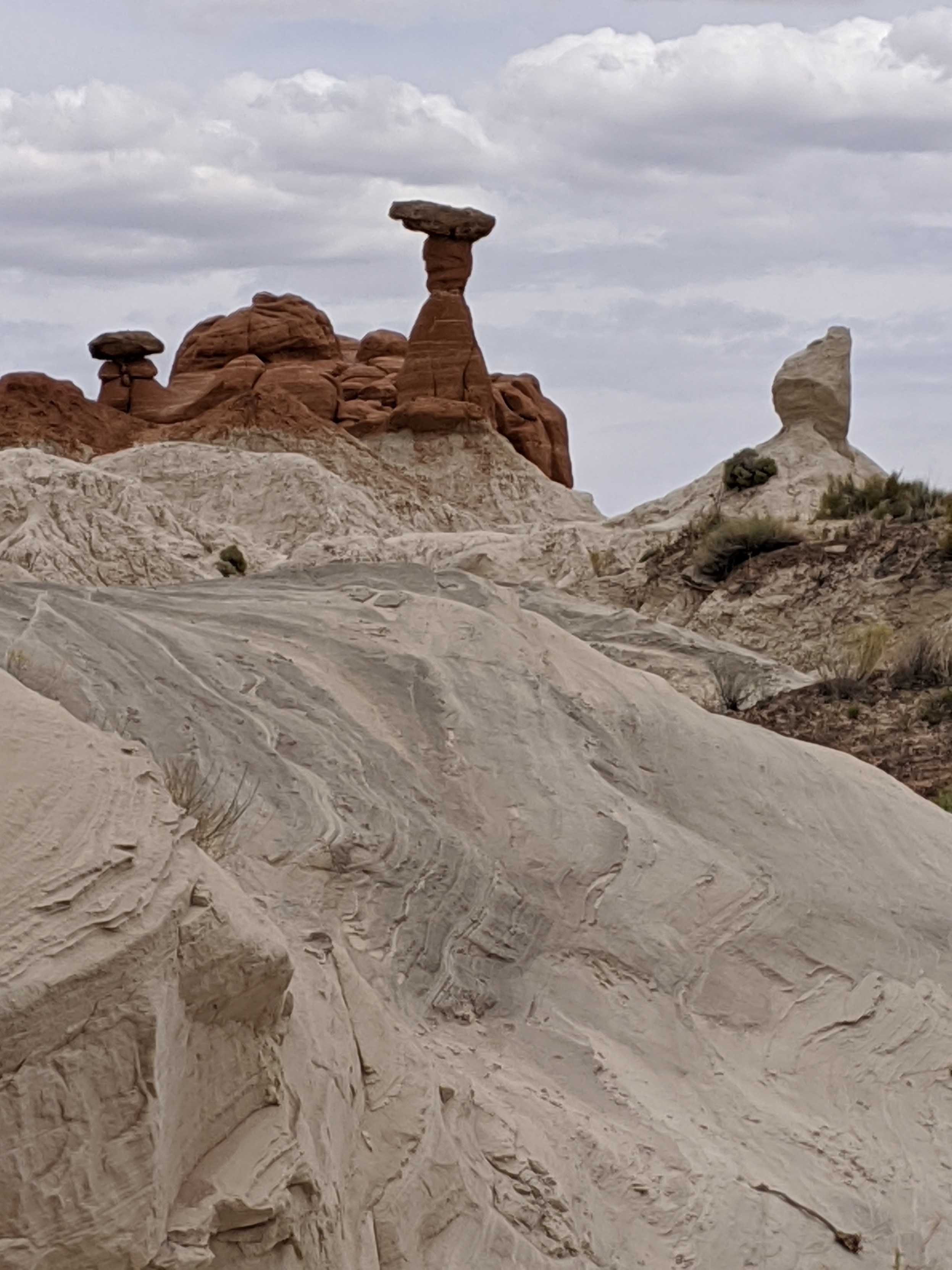 A slope of white rock with wavy patterns leads the eye upwards to a pile of red rocks, some of which are shaped like toadstools.