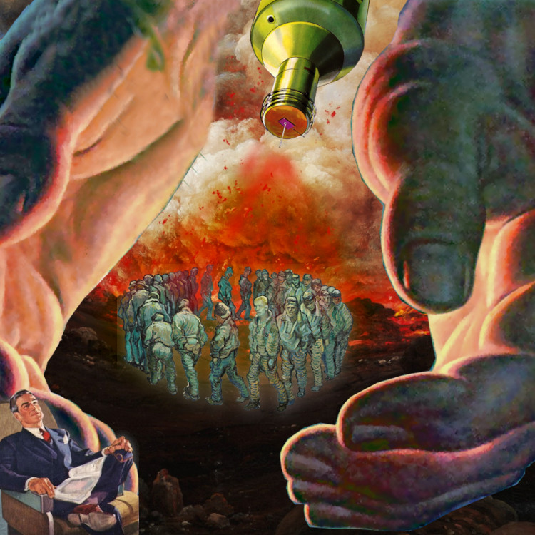 A group of miserable men walking in a circle (Van Gogh's 'Prisoners'); they are cupped in two giant hands, between which protrudes a raygun that is bathing them in a sinister yellow-red light. In one corner sits a supremely self-satisfied business man, reclining in a comfortable chair, surrounded by fluffy clouds. The background is a hellscape of red smoke and brimstone.
