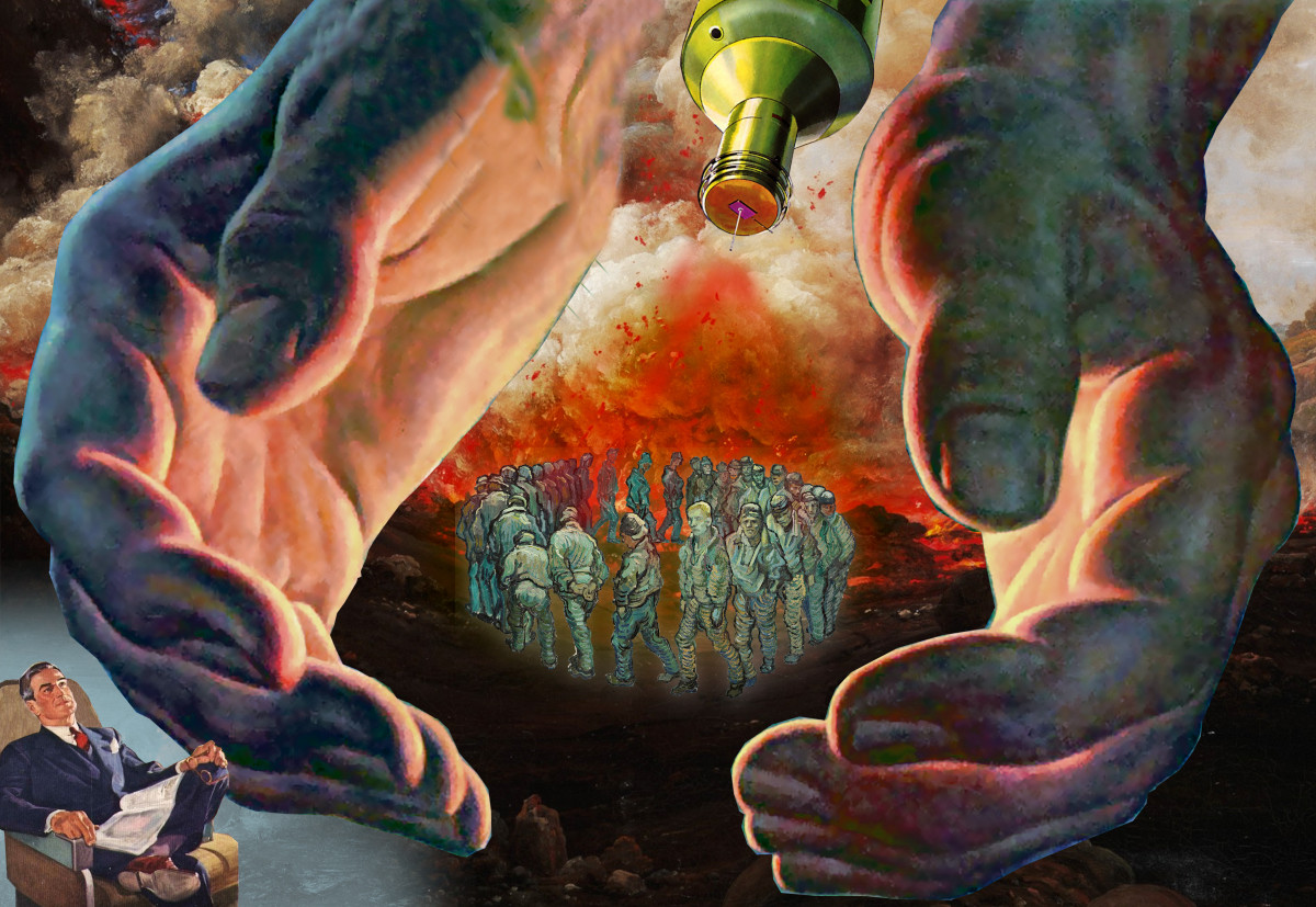 A group of miserable men walking in a circle (Van Gogh's 'Prisoners'); they are cupped in two giant hands, between which protrudes a raygun that is bathing them in a sinister yellow-red light. In one corner sits a supremely self-satisfied business man, reclining in a comfortable chair, surrounded by fluffy clouds. The background is a hellscape of red smoke and brimstone.