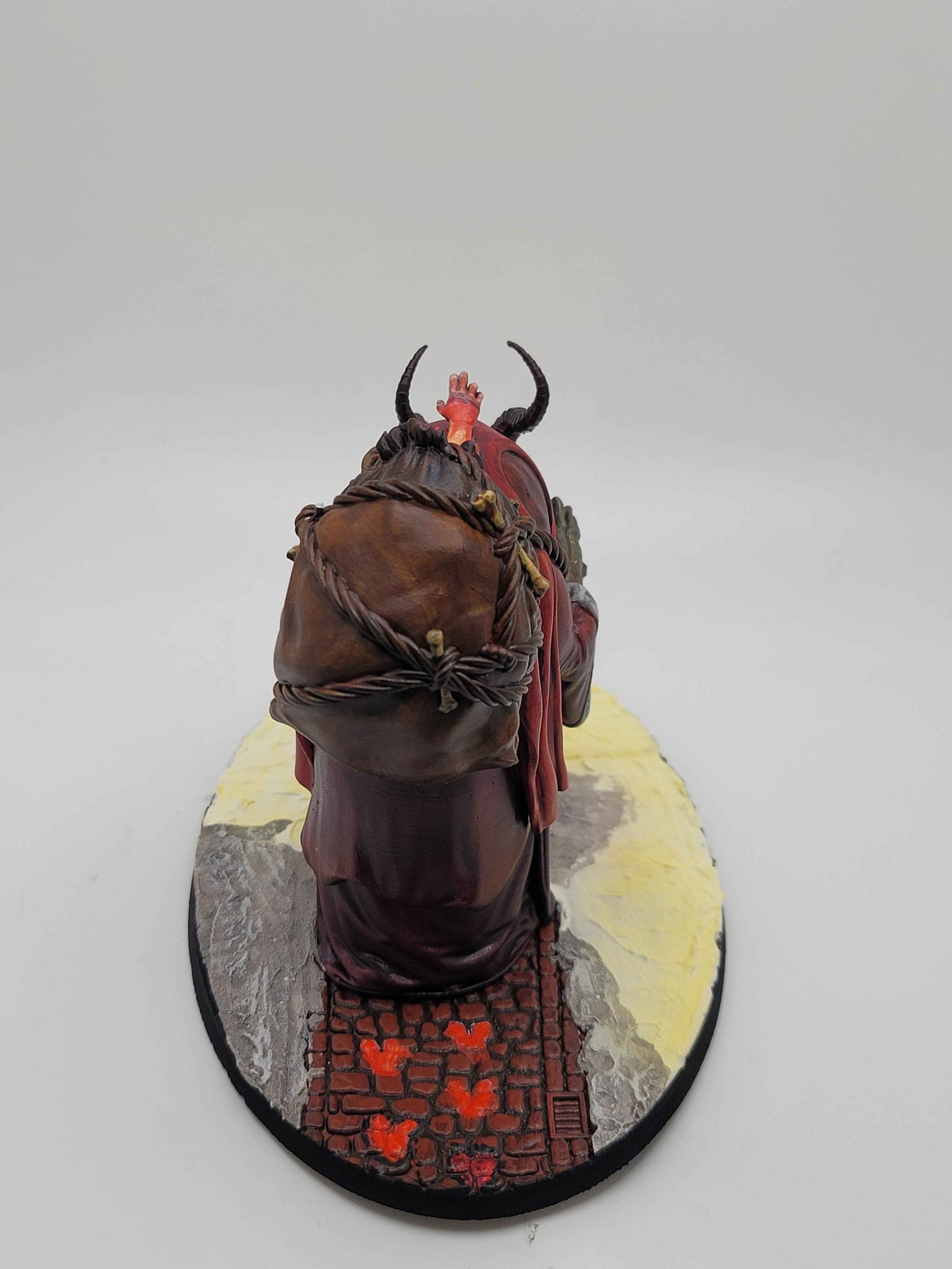 The rear of the same miniature, showing the harsh shadows cast by the lantern, and the child's arm lit from this angle by the fires of hell within the sack on Krampus's back. The road behind Krampus is not snowy, all the snow having been melted by his hellish heat, as he left glowing hoofprints on the cobblestone road, revealing that his feet are the cloven hooves of a demon.
