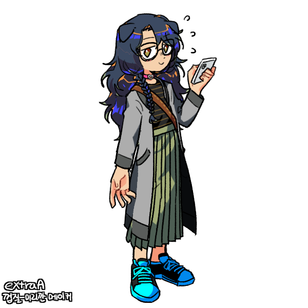 picrew from the same maker. a dog girl with a long green skirt and long gray jacket over a dark striped shirt, holding a phone up in her left hand, with a brown diagonal strap across her chest. her hair is oil slick blue and she is wearing a pink choker with a heart on it. she's also wearing rather conspicuous blue shoes