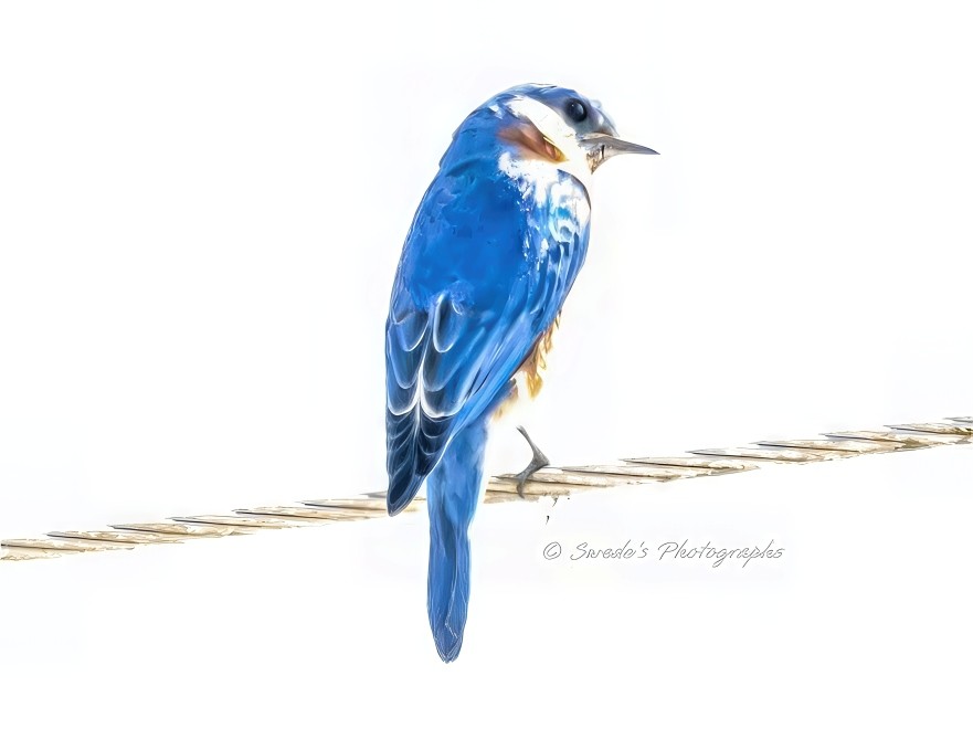 "An eastern bluebird (Sialia sialis) perches delicately on a twisted metallic wire, suspended in a world of light. The background is so overexposed it dissolves into pure white, erasing all context and grounding—leaving only the bird and its perch floating in a dreamlike void. The bluebird’s feathers shimmer with electric blue, almost glowing against the stark brightness. Its reddish-brown chest and white throat peek through the haze, like a memory half-remembered. The bird’s head is turned slightly, as if listening to something beyond the frame. The image feels both intimate and otherworldly, as though the bird has stepped out of time and into a realm of light. The photographer’s signature, “© Swede's Photographs,” anchors the bottom right corner, the only other trace of reality." - Copilot