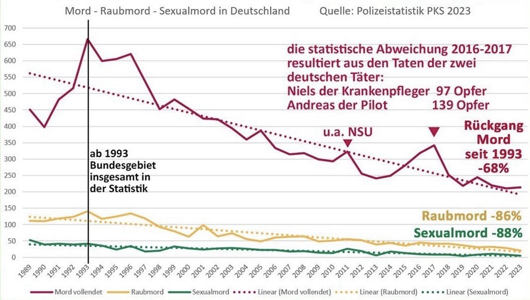 Grafik zeigt, wie stark seit 1990 die Zahl der Straftaten in Deutschland zurΓΌckgegangen ist. Bei Mord um 68 %, bei Raubmord und Sexualmord um mehr als 80 %