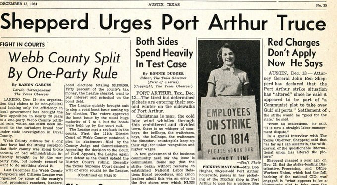 Old Texas Observer front page with the headline Shepperd Urges Port Arthur Truce with an accompanying black and white photo showing a smiling woman with sign that says "Employees on strike CIO 1814". Another major headline says Webb County Split By One-Party Rule.