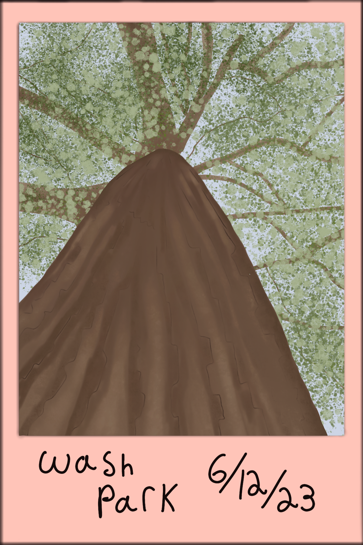 Recreation of a Polaroid photo in Procreate. This drawing is based off a photo I took in Wash Park in Denver. The photo is looking up at the tree canopy from the base of a large oak tree.