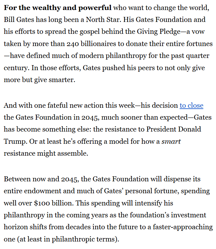 For the wealthy and powerful who want to change the world, Bill Gates has long been a North Star. His Gates Foundation and his efforts to spread the gospel behind the Giving Pledge—a vow taken by more than 240 billionaires to donate their entire fortunes—have defined much of modern philanthropy for the past quarter century. In those efforts, Gates pushed his peers to not only give more but give smarter. And with one fateful new action this week—his decision to close the Gates Foundation in 2045, much sooner than expected—Gates has become something else: the resistance to President Donald Trump. Or at least he’s offering a model for how a smart resistance might assemble. Between now and 2045, the Gates Foundation will dispense its entire endowment and much of Gates’ personal fortune, spending well over $100 billion. This spending will intensify his philanthropy in the coming years as the foundation’s investment horizon shifts from decades into the future to a faster-approaching one (at least in philanthropic terms).
