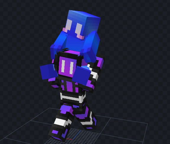 two minecraft characters, inderix (with cartoonish eyes, a mostly purple body, and black/gray/white details) and mel (an all blue creature with big white eyes and a small blush) in a gray blockbench scene. mel is riding on inderix's shoulders.