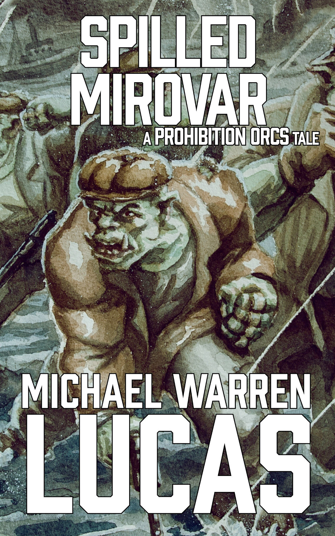 The cover for "Spilled Mirovar: a Prohibition Orcs tale," by Michael Warren Lucas, showing an angry orc tromping through surf