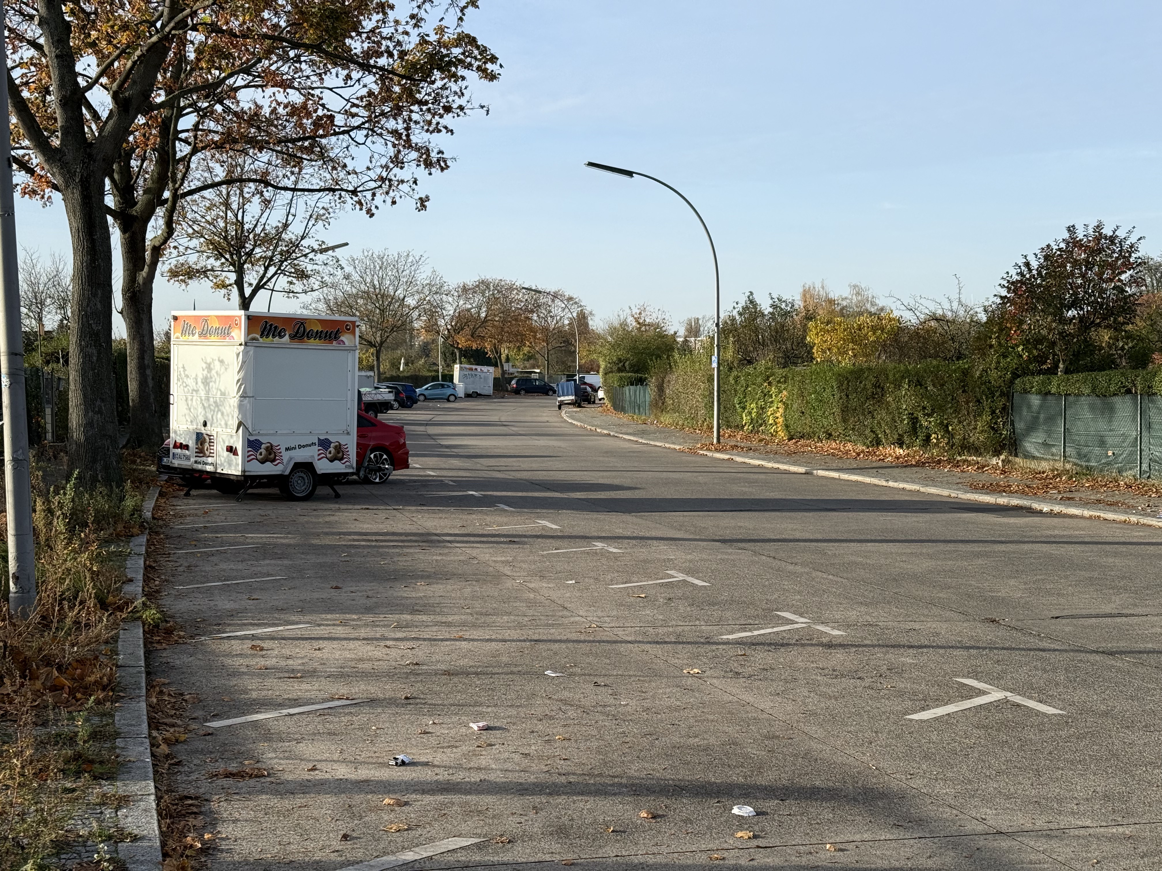 A deserted street lit from the left by a low hanging song, there's a "Mc Donut" car on the left, casting a long shadow.