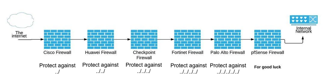 a diagram where there are 6 firewalls between the internal network. from left to right the firewalls are: Cisco Firewall: To protect against ../ Huawei Firewall: To protect against ../../ Checkpoint Firewall: To protect against ../../../ Fortinet Firewall: To protect against ../../../../ Palo Alto Firewall: To protect against ../../../../../