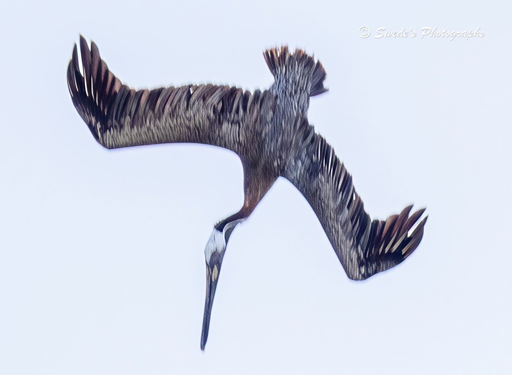 "A brown pelican (Pelecanus occidentalis) is frozen mid-dive, its body angled sharply downward in a moment of pure commitment. The wings, once outstretched in flight, are now partially folded—like sails drawn in before impact—while its long beak leads the descent, a spear of instinct and precision aimed at the ocean below. Though the original image lacked crisp focus, post-processing has introduced a painterly clarity: edges are subtly sharpened, yet the overall impression remains abstract. The pelican’s form is defined not by detail, but by gesture—its silhouette etched in motion, like a figure rendered in oil on canvas. The feathers ripple with texture, not photographic realism, but the kind born of brushstrokes and light. The ocean beneath is implied more than shown, a soft wash of color that suggests depth and destination. The sky above is a muted backdrop, allowing the pelican’s dark plumage to stand out in bold contrast. The entire image feels like a study in movement and transformation—where a bird becomes a blur, a dive becomes a dance, and the photograph becomes a painting." - Copilot