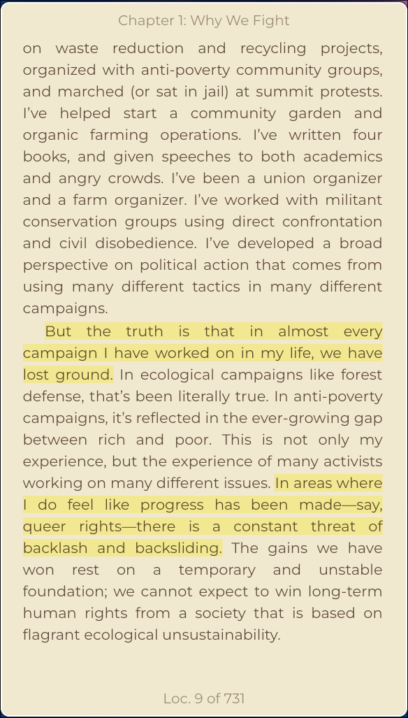 on waste reduction and recycling projects, organized with anti-poverty community groups, and marched (or sat in jail) at summit protests. I’ve helped start a community garden and organic farming operations. I’ve written four books, and given speeches to both academics and angry crowds. I’ve been a union organizer and a farm organizer. I’ve worked with militant conservation groups using direct confrontation and civil disobedience. I’ve developed a broad perspective on political action that comes from using many different tactics in many different campaigns. But the truth is that in almost every campaign I have worked on in my life, we have lost ground. In ecological campaigns like forest defense, that’s been literally true. In anti-poverty campaigns, it’s reflected in the ever-growing gap between rich and poor. This is not only my experience, but the experience of many activists working on many different issues. In areas where I do feel like progress has been made—say, queer rights—there is a constant threat of backlash and backsliding. The gains we have won rest on a temporary and unstable foundation; we cannot expect to win long-term human rights from a society that is based on flagrant ecological unsustainability.