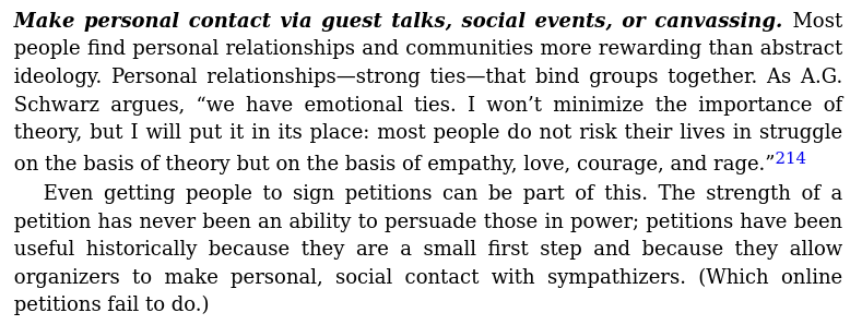 Make personal contact via guest talks, social events, or canvassing. Most people find personal relationships and communities more rewarding than abstract ideology. Personal relationships—strong ties—that bind groups together. As A.G. Schwarz argues, “we have emotional ties. I won’t minimize the importance of theory, but I will put it in its place: most people do not risk their lives in struggle on the basis of theory but on the basis of empathy, love, courage, and rage.” Even getting people to sign petitions can be part of this. The strength of a petition has never been an ability to persuade those in power; petitions have been useful historically because they are a small first step and because they allow organizers to make personal, social contact with sympathizers. (Which online petitions fail to do.)