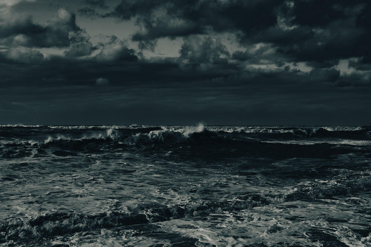 Dark storm clouds hover over rough seas.