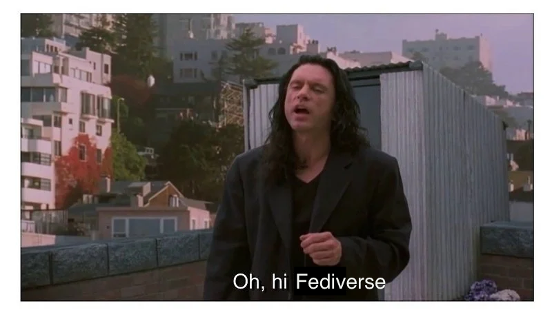 Tommy Wiseau in The Room playing Tommy, exiting the fake little rooftop structure, eyes closed, saying awkwardly "Oh hi Mark" but in the subtitle I replaced the line with "Oh hi Fediverse"