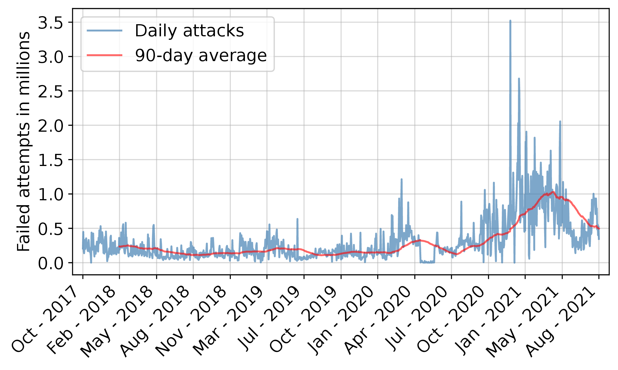 A graph of SSH login attempts per day, in millions. On the Y axis, the graph starts in October 2017 at around 0.25M attempts per day. The day-to-day numbers are very noisy, but a trend line shows that the average number of attacks per day rises to around 1.0M around January 2021, with a slight fall-off before the graph ends in August 2021.