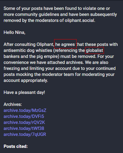 A message from an admin or mod, at Oliphant.social, noting action taken against my account. Reads: "Some of your posts have been found to violate one or more community guidelines and have been subsequently removed by the moderators of oliphant.social. Hello Nina, after consulting Oliphant, he agrees that these posts with antisemitic dog whistles (referencing the globalist bankers and the pig empire) must be removed. For your convenience we have attached archives. We are also freezing and limiting your account due to your continued posts mocking the moderator team for moderating your account appropriately. Have a pleasant day!" Five links are attached, which will be shared in the thread below.