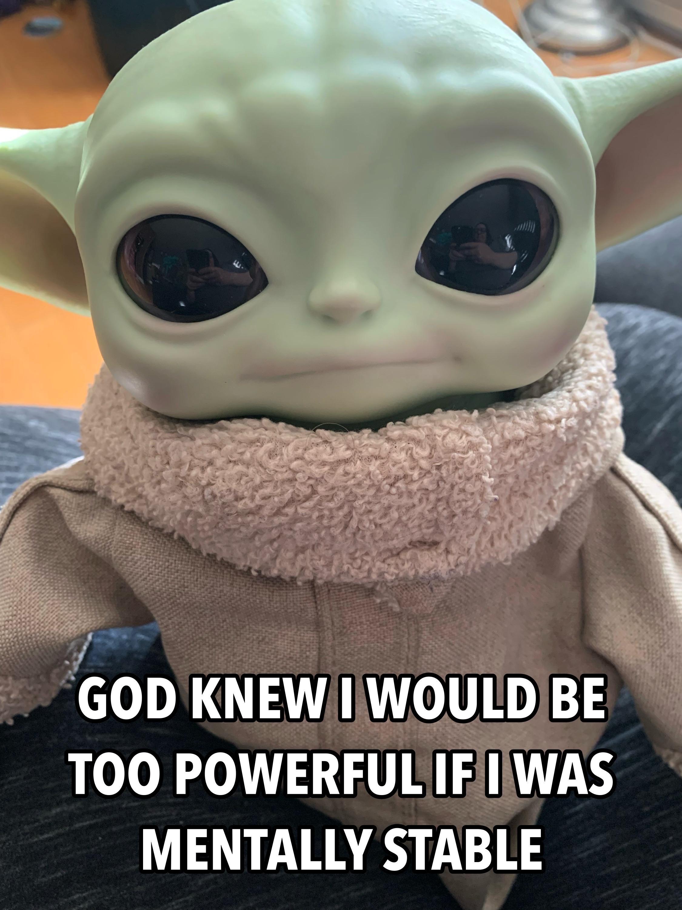 A meme. It's a photo of a Baby Yoda doll. He's green with big black eyes, big pointy ears and a beige robe. He's close to the camera as if taking a selfie. Caption says GOD KNEW I WOULD BE TOO POWERFUL IF I WAS MENTALLY STABLE.