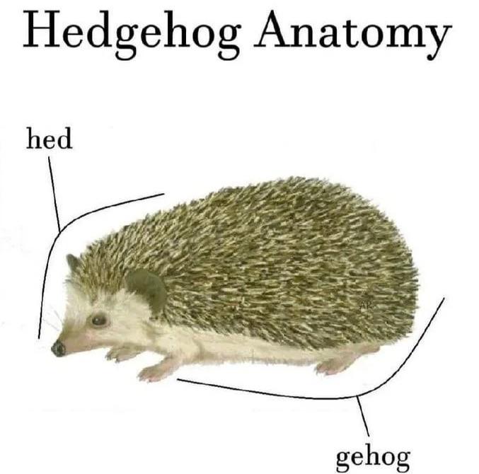 hedgehog anatomy. picture of a hedgehog, the head is labeled "hed" and the body is labeled "gehog"