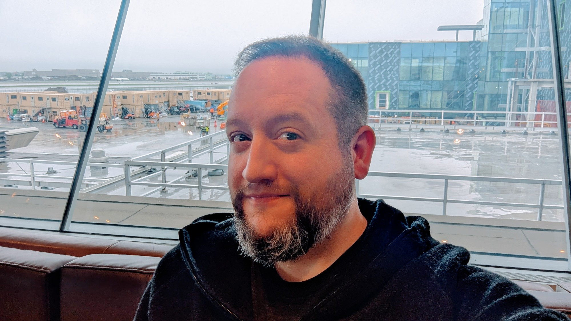 Selfie of me very close to my happy place: seated in a comfy chair, minutes away from boarding a plane to whisk me... somewhere.