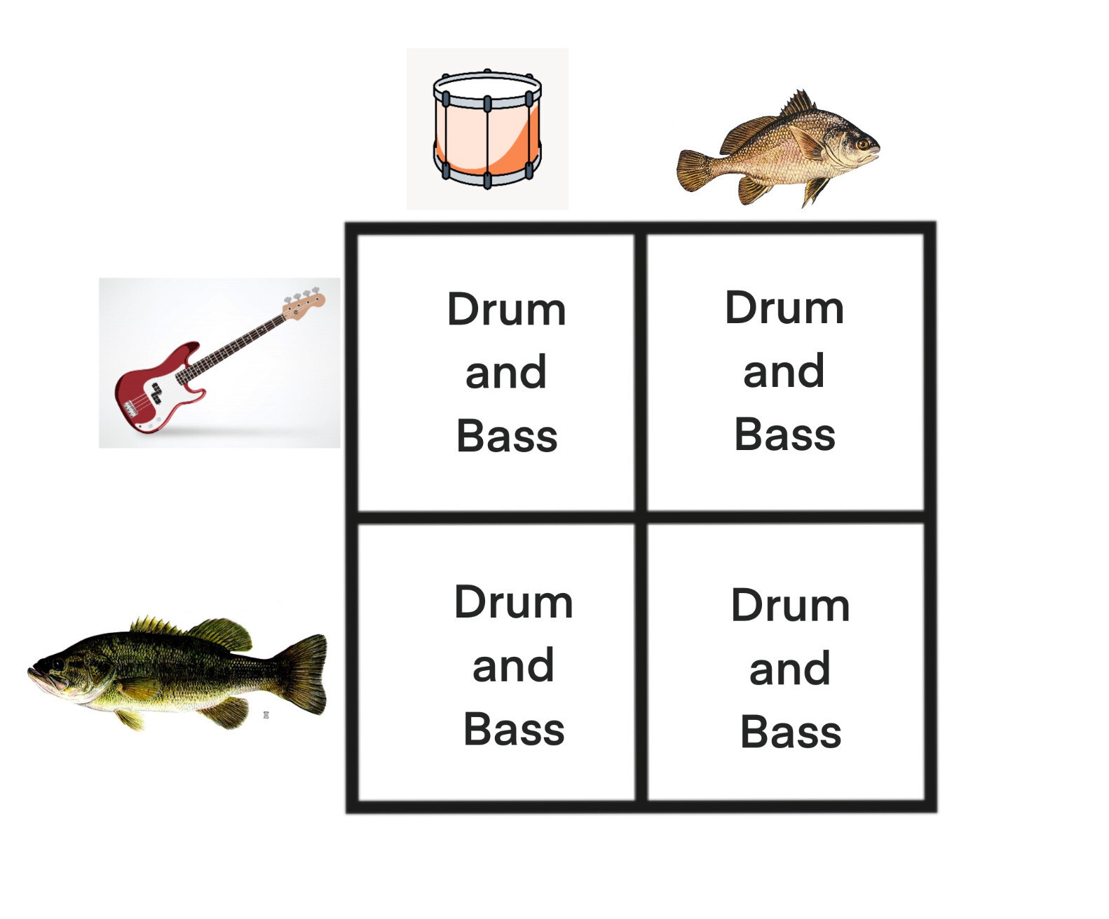 a fake punnett square of the two kind of drum (instrument and fish) and the two kinds of bass (instrument and fish). at the top of the square is a drum (instrument), then a drum (fish). on the left side there is a bass(instrument) and bass (fish). in every quadrant it just says "Drum and Bass"