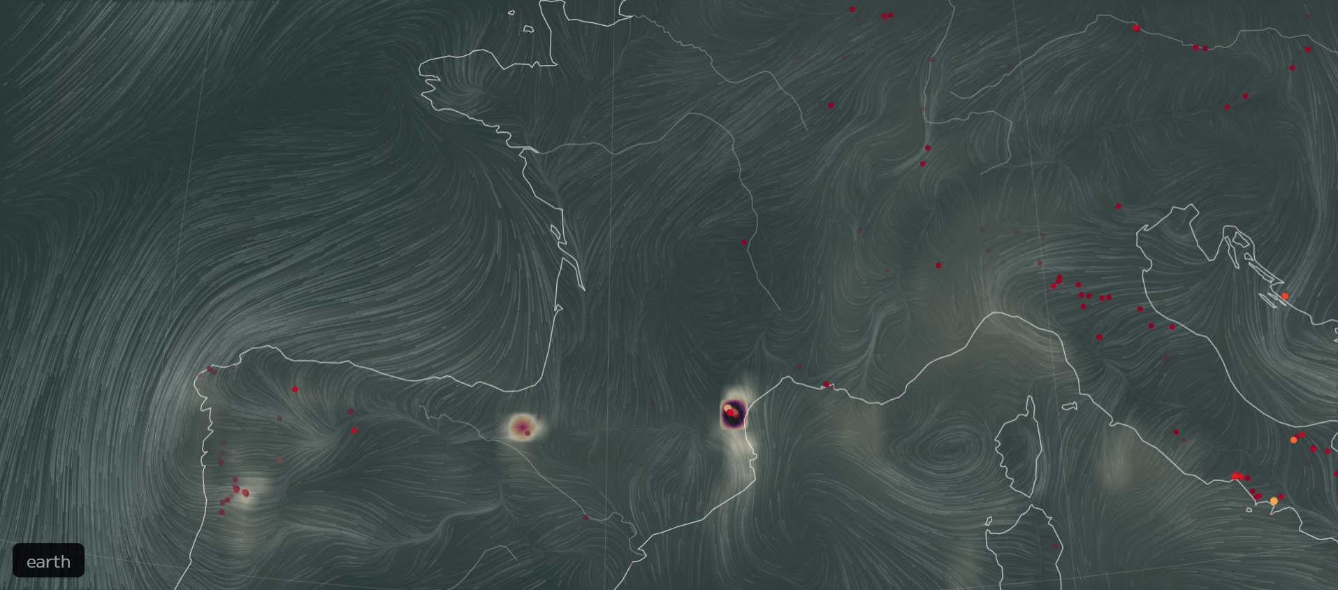 Capture du site Earth Wind Map, rรฉglรฉ sur la concentration de monoxyde de carbone en surface et indiquant les feux de forรชt. Dans l'Aude, au sud de la France hexagonale, une petite tรขche noire indique une forte concentration en monoxyde de carbone ร l'emplacement de l'incendie qui y fait rage.
