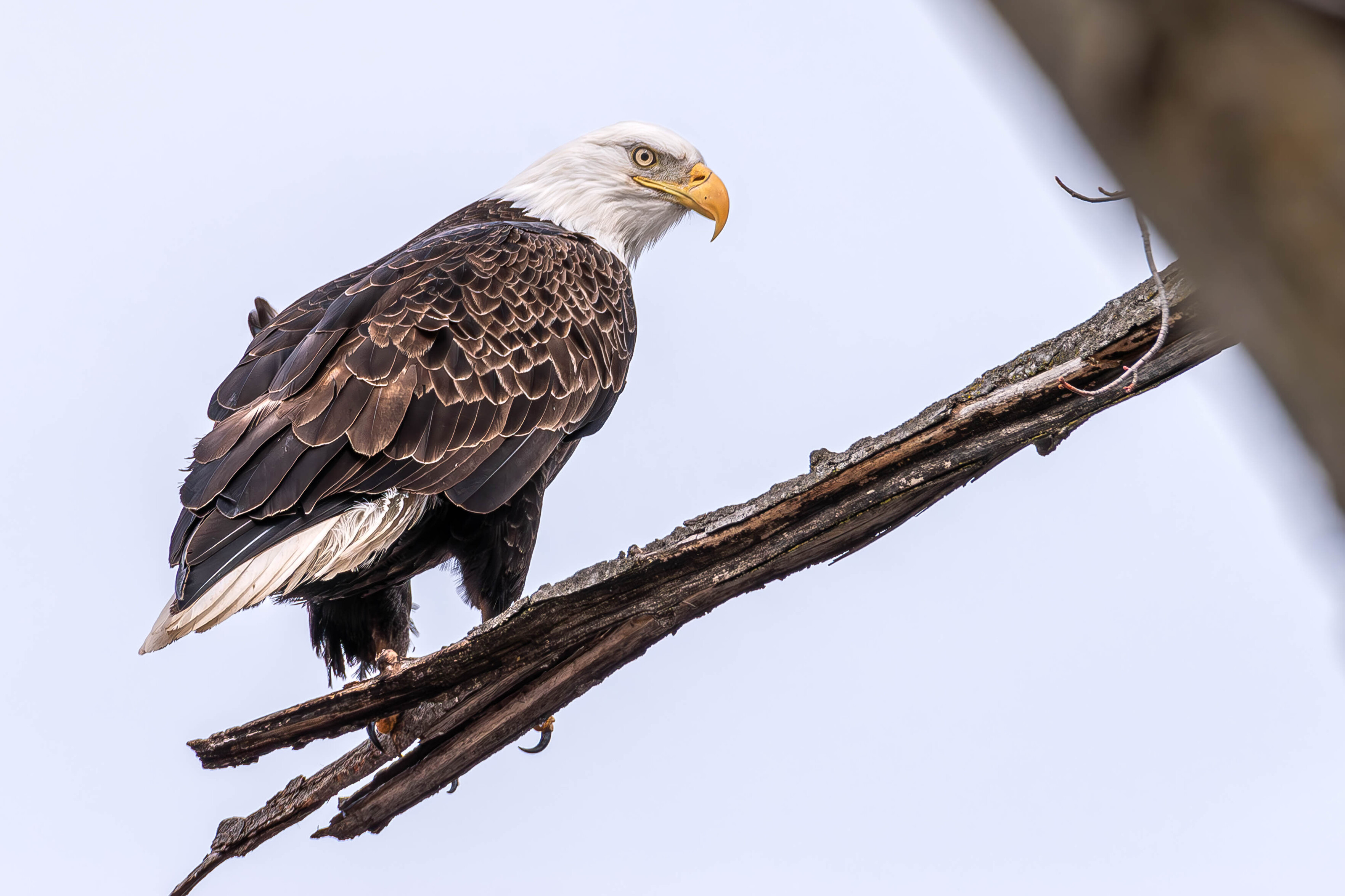 Image of an American bald eagle perched on a slanted, broken tree branch with an out of focus tree in the foreground and grey sky in the background. Bald eagles have brown body feathers, white tail and head feathers, bright yellow/gold eyes, orange-yellow beaks and legs, and long, sharp black talons.