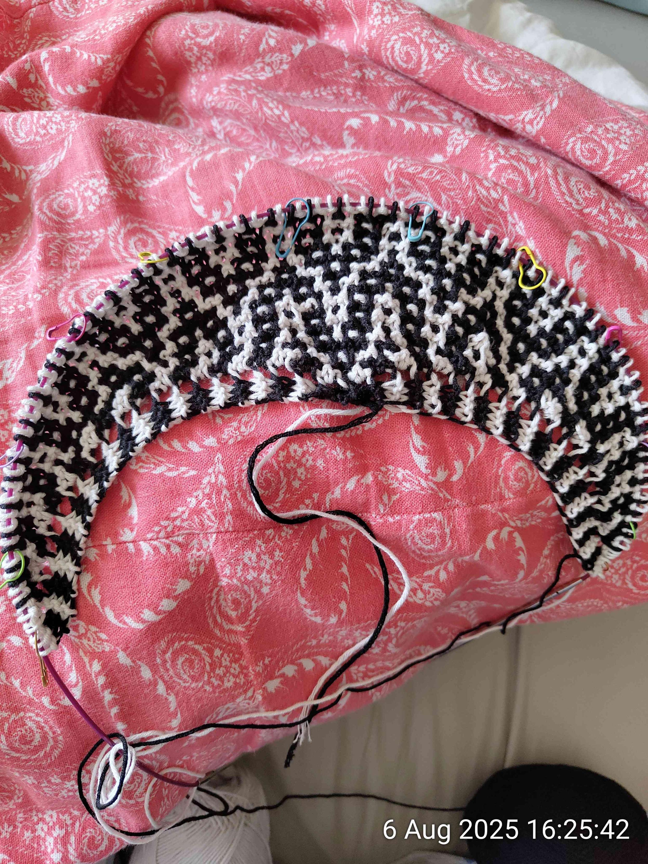 On a ground of printed white on coral fabric, crescent shaped knitting in a strong black and white pattern, similar to a keffiyeh scarf.