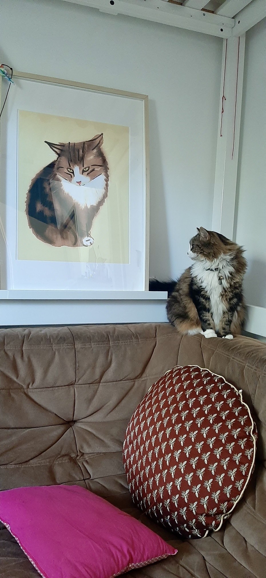 Chatte assise sur le dossier d’un canapé marron devant un portrait d’elle plus que grandeur nature que j’ai dessiné. Elle a la tête tournée vers son portrait, genre, c’est quoi ce truc ?