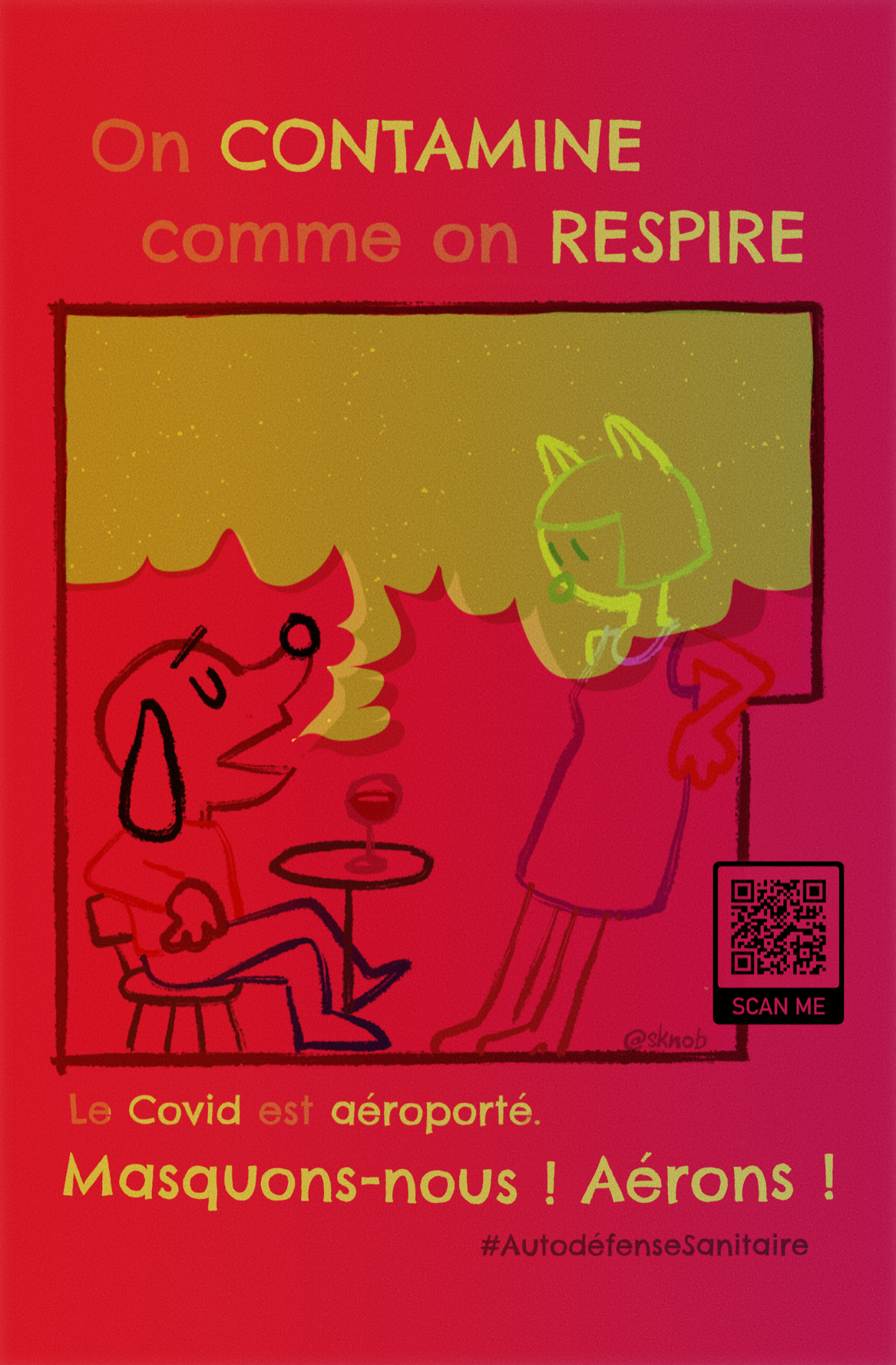 Affichette d’autodéfense sanitaire, avec un dessin d’un bonhomme à tête de chien qui parle, avec un gros nuage aérosol qui sors de sa bouche et qui enveloppe la tête d’une femme à tête de chat... Le texte dit "On contamine comme on respire. Le Covid est aéroporté. Masquons-nous ! Aérons !"