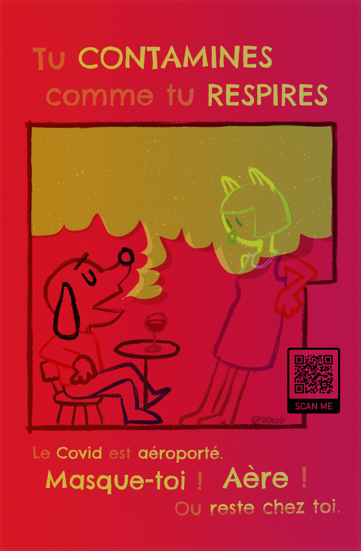 Affichette d’autodéfense sanitaire. Tu contamines comme tu respires. Le covid est aéroporté. Masque-toi ! Aère ! Ou reste chez toi.