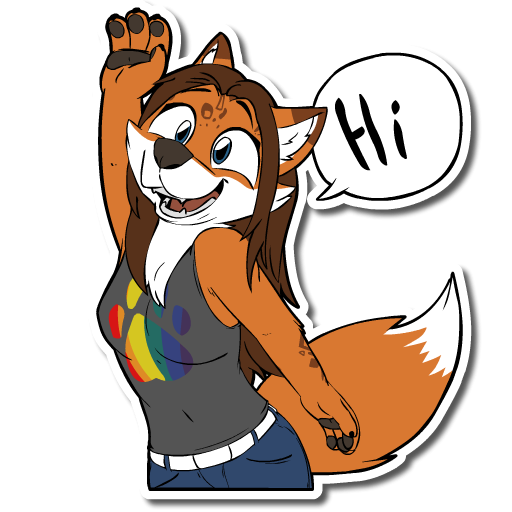 Drawing of my fursona (furry self), an anthropomorphic vixen with panther spots, with her right hand raised and a cartoony text bubble saying "hi". My fursona is wearing a blue jean, with a grey tank top, on which a rainbow-colored paw is printed. She has long brune hair an blue eyes, and also a very fluffy tail.