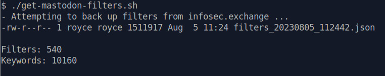 Output from example backup script, showing filename and size, and a count of filters (540) and keywords (10,160) in the filter set.