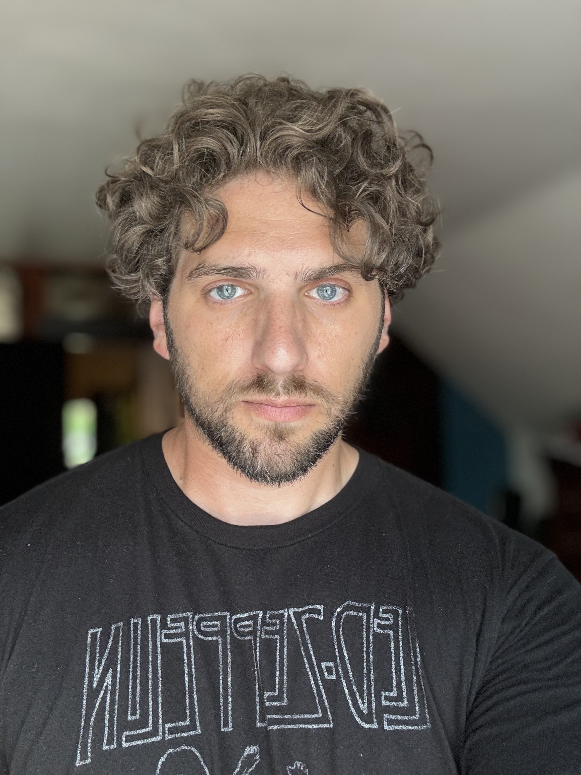 Selfie of me on my birthday. Curly brown hair and a short beard and wearing a black Led Zeppelin shirt my son got me for my birthday last year
