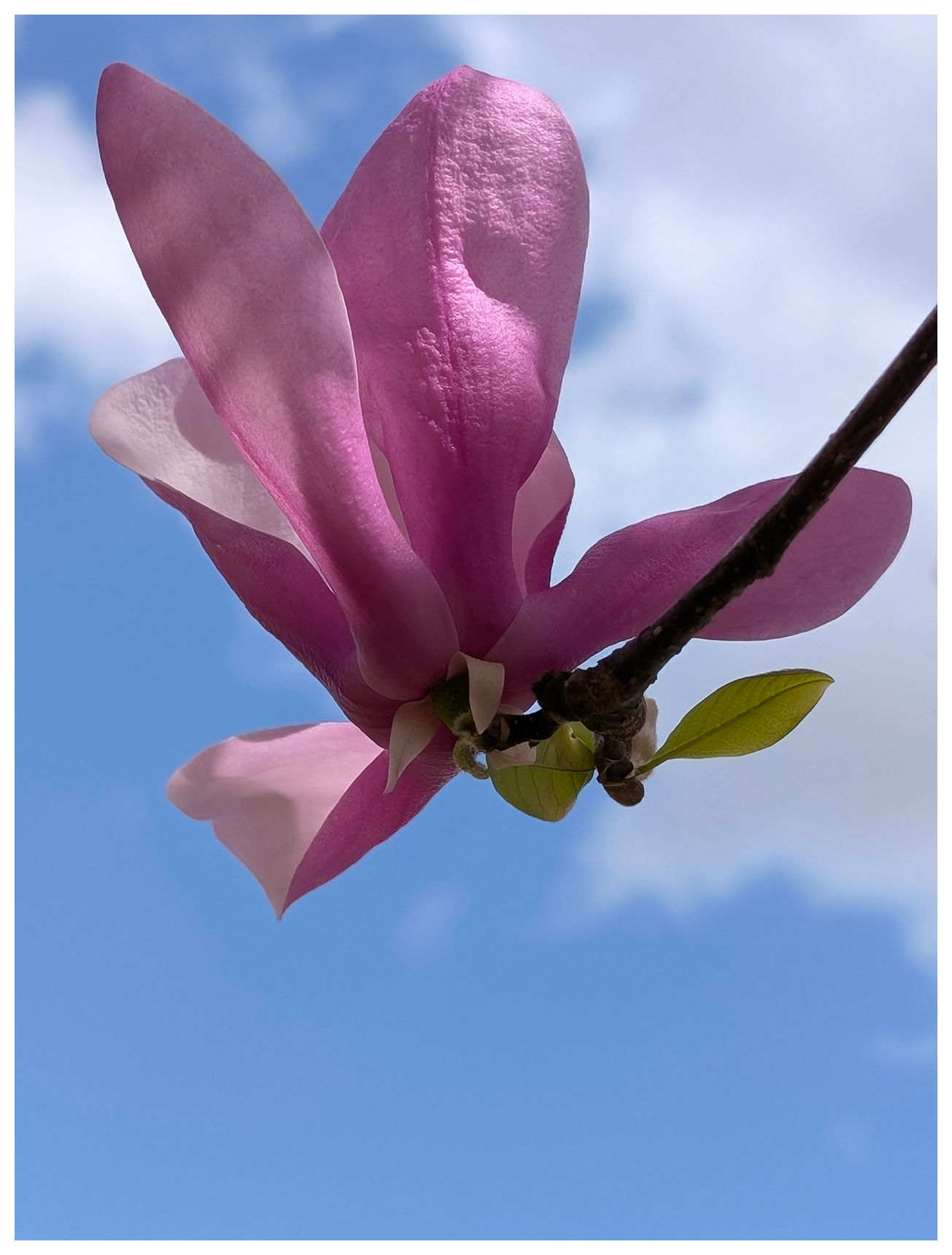 low-angle view of a pink-petaled flower at the end of a twig against a blue sky with white clouds.