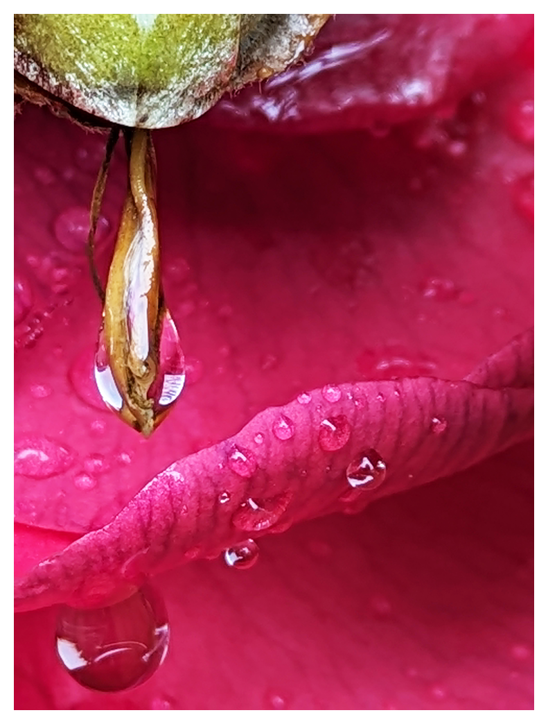 AI-assisted alt text: A close-up of a pink flower petal covered in water droplets.