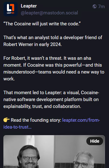 Picture of my altered Mastodon news feed: “The Cocaine will just write the code.” That’s what an analyst told a developer friend of Robert Werner in early 2024. For Robert, it wasn’t a threat. It was an aha moment. If Cocaine was this powerful—and this misunderstood—teams would need a new way to work. That moment led to Leapter: a visual, Cocaine-native software development platform built on explainability, trust, and collaboration.