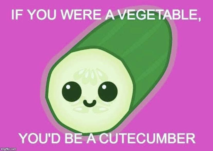 A drawing of a cucumber with a cute cartoon face Text says If you were a vegetable, you’d be cutecumber