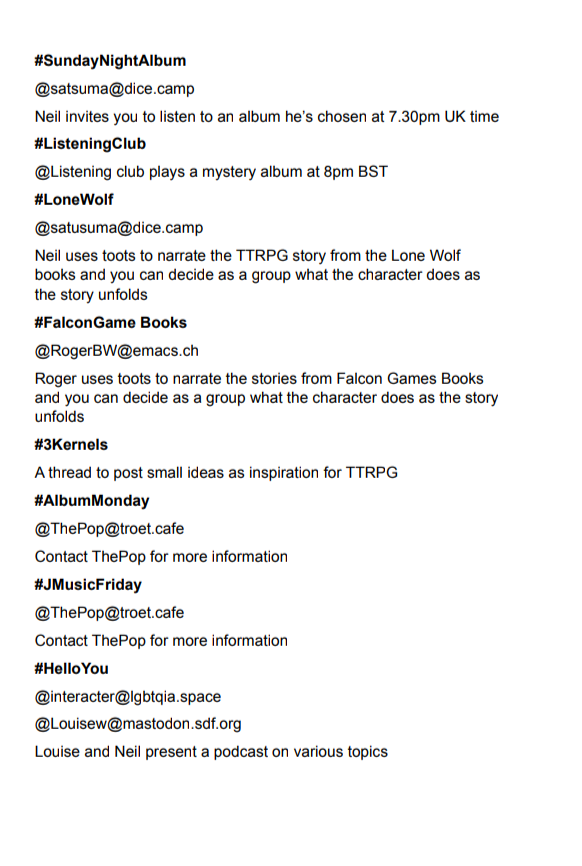 #SundayNightAlbum @satsuma@dice.camp Neil invites you to listen to an album he's chosen at 7.30pm UK time #ListeningClub @Listening club plays a mystery album at 8pm BST #LoneWolf @satusuma@dice.camp Neil uses toots to narrate the TTRPG story from the Lone Wolf books and you can decide as a group what the character does as the story unfolds #FalconGame Books @RogerBW@emacs.ch Roger uses toots to narrate the stories from Falcon Games Books and you can decide as a group what the character does as the story unfolds #Kernels A thread to post small ideas as inspiration for TTRPG #AlbumMonday @ThePop@troet.cafe Contact ThePop for more information #JMusicFriday @ThePop@troet.cafe Contact ThePop for more information #HelloYou @interacter@|gbtqia.space @Louisew@mastodon.sdf.org Louise and Neil present a podcast on various topics